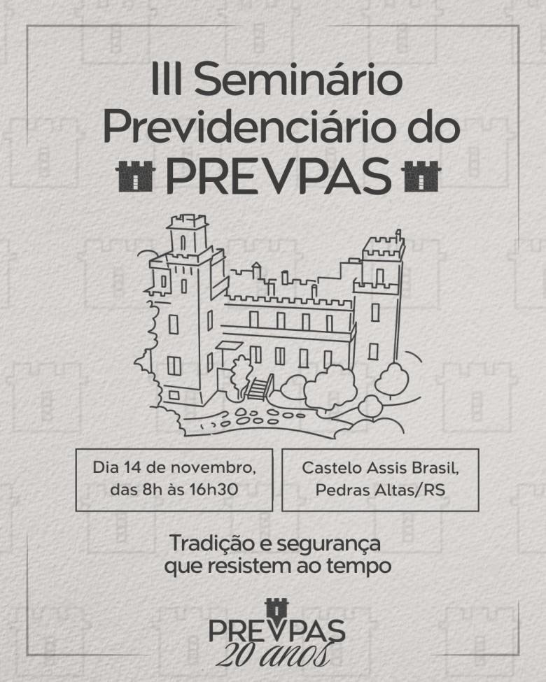 Com muita emoção e orgulho celebramos 20 anos do PREVPAS, uma caminhada feita por cada servidor público e gestor de RPPS que acredita no futuro da nossa previdência! É a dedicação de vocês que fortalece a sustentabilidade do nosso RPPS, e é por isso que queremos convidar todos para o III Seminário Previdenciário do PREVPAS, um espaço pensado especialmente para trocar experiências, aprender e crescermos juntos.Vamos ouvir especialistas apaixonados pelo que fazem, que vão trazer ideias e práticas para tornar nossa gestão cada vez mais forte e capaz de garantir segurança a todos. Juntos, vamos celebrar esta história linda e escrever novos capítulos para a previdência pública que merecemos!